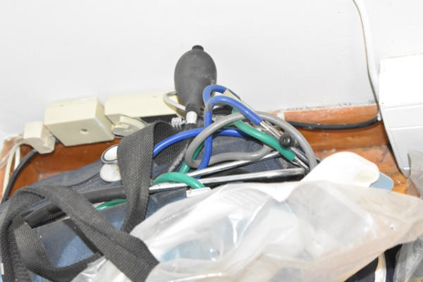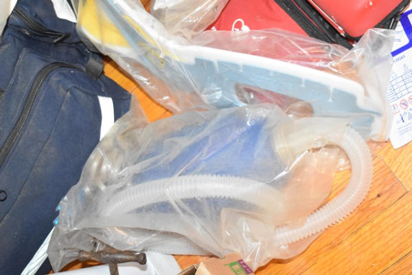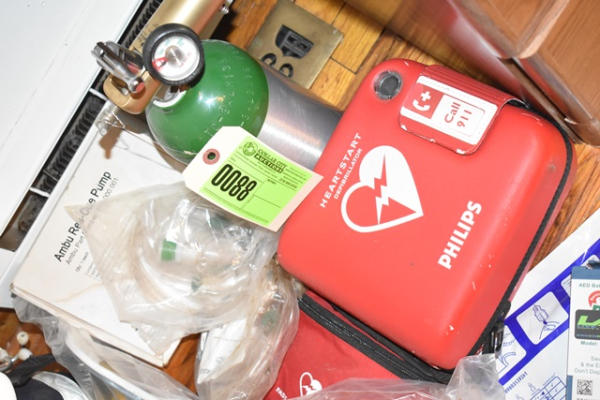 Medical lot including oxygen tank, heart start defibrillator (includes a new battery and new pads), also included bandages, OB Gyn kit, neck collar, New York State Trooper First Responder Kit