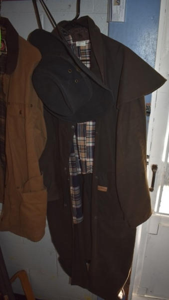 Outback Jacket (size L), hat (size L), Stockman Riding Raincoat (size M)