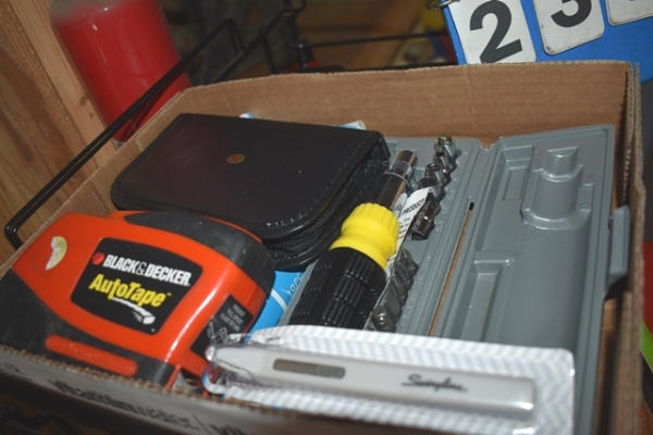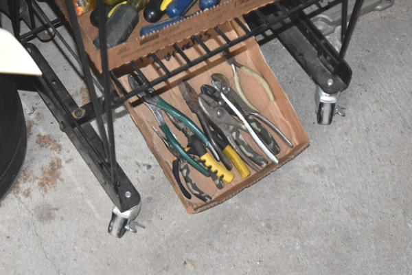 Rack with contents consisting of tools, bungee cords, screwdrivers, scissors, etc.