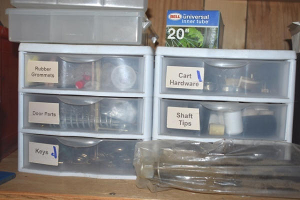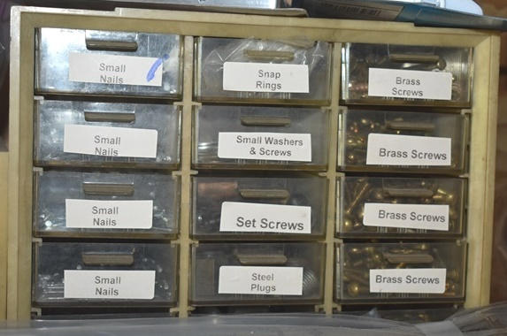 Shelf lot including rubber plastic washers, small nails, bracketry