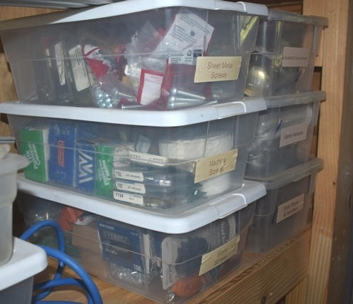 Shelf lot including deadbolt door handles, cabinet hardware, wood screws, hinges, level