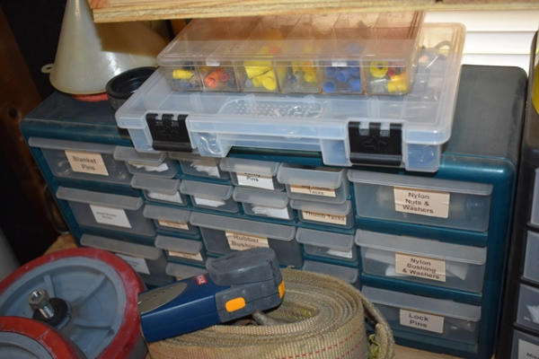 Lot consisting of nylon nuts, washers, nylon bushings, safety pins, wheels, plastic organizer bins