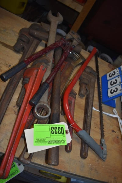 Lot of pipe wrenches, bow saw, bolt cutters, etc.