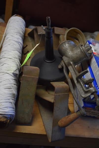 Lot including small hand held snake, roof brackets, vintage meat grinder and moth balls