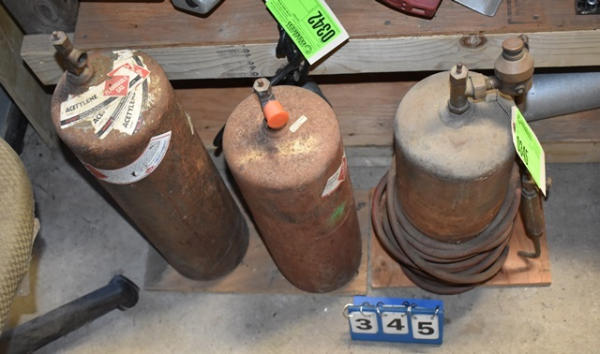 Lot of 3 small acetylene tanks and 1 with torch head and regulator