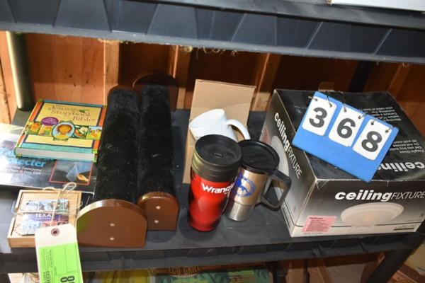 Shelf lot including "Jesus The Story Book Bible", cups, ceiling fixture, etc.
