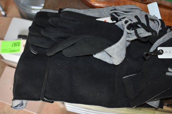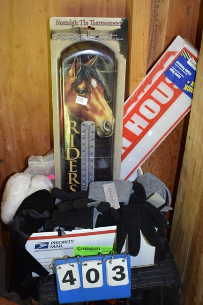 Box lot including gloves, horse thermometer, open house signs, etc.