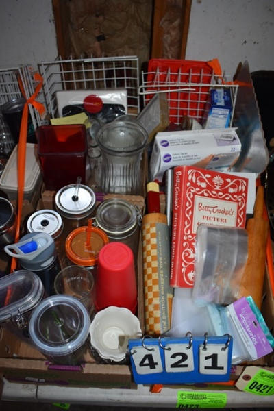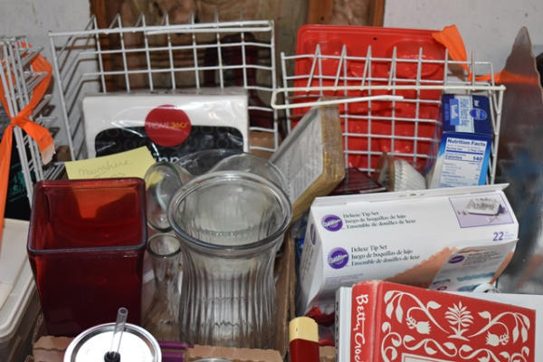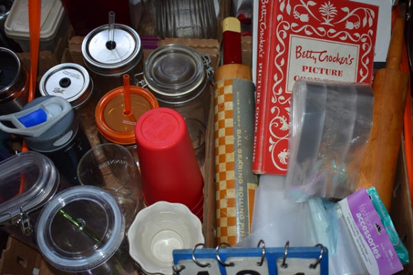 Lot of 4 box lots consisting of cookbooks, deluxe tip set, cookie cutters, vases, etc.