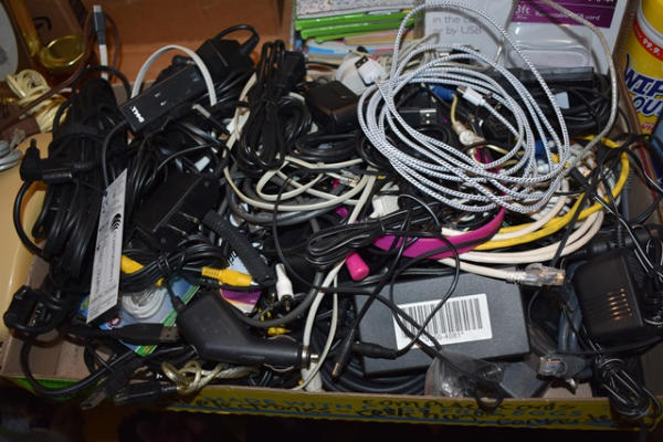 Box lot with computer cords, charging cords, AC cords, etc., approx. 68 +/- cords
