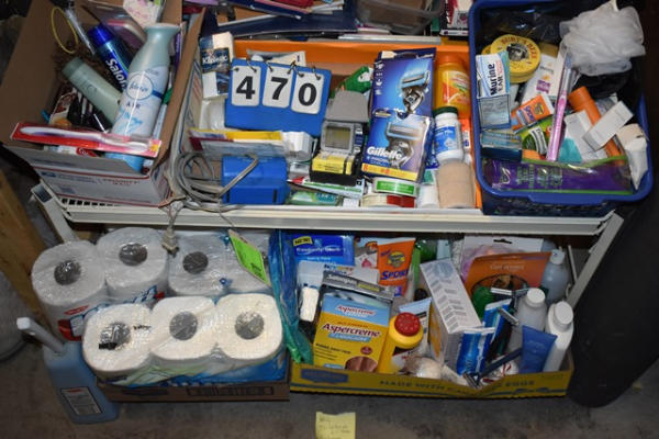 Lot of bathroom toiletries including toilet paper, vitamins, air freshener, razors