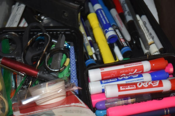 Bin of office supplies including Dry Erase Pens, markers, pens, scissors, etc.