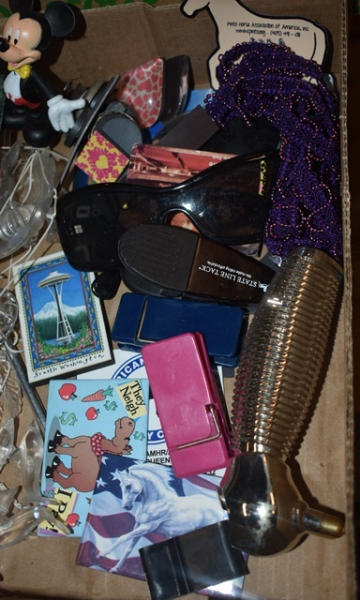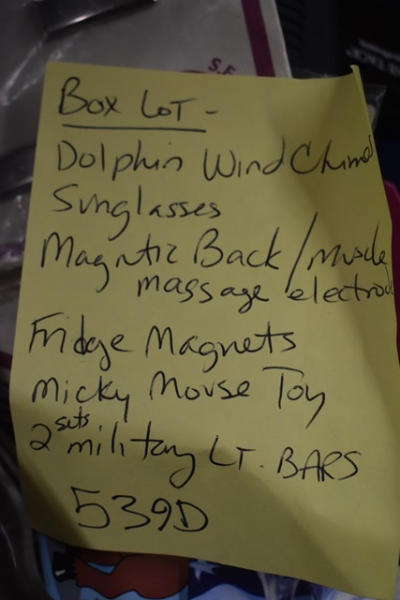 Box lot with windchimes, sunglasses, fridge magnets, and magnetic back massager