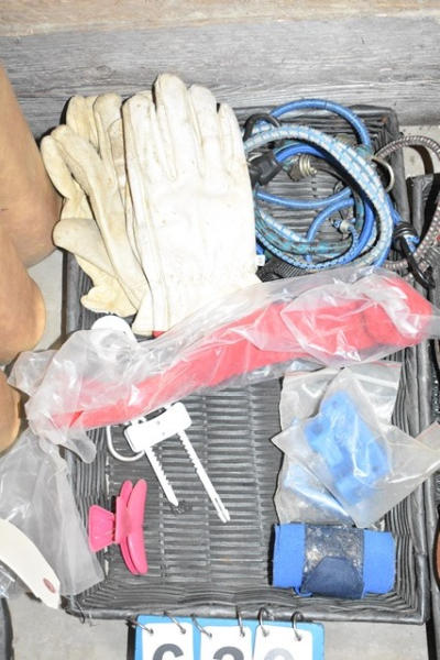 Lot of 2 pairs of leather gloves, 5 bungee cords, stainless steel tray, numbers clip, 4 bucket holders, 1 tail wrap and misc. hooks and snaps