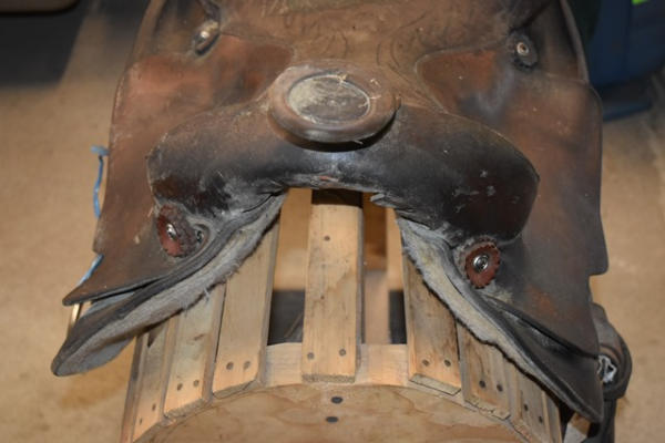 Saddle, leather wrapped horn, suede seat, no fenders or stirrups, 16" seat, 7" gullet