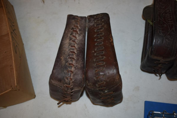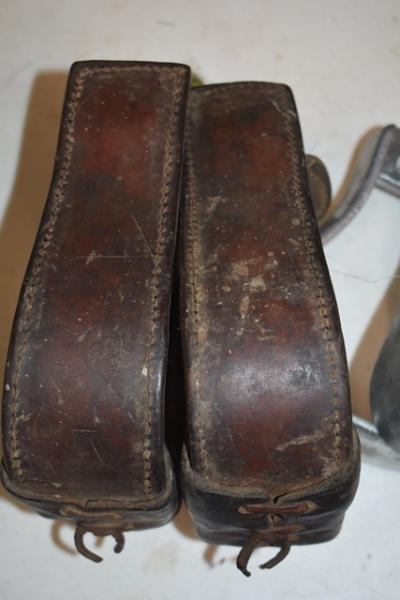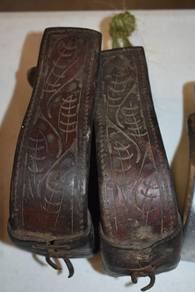 1 pair of brushed aluminum show stirrups and 1 pair tooled leather stirrups, 1 pair of leather stitched and 1 pair of kids plastic stirrups