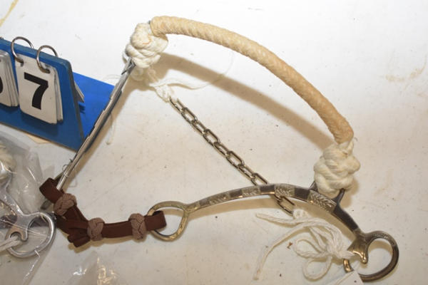Stainless steel brushed chuck hackamore with rawhide braided rope noseband, 8 1/4" cheeks with silver trim, complete with leather curb connector and dog curve chain for intermediate horse, medium to strong effect