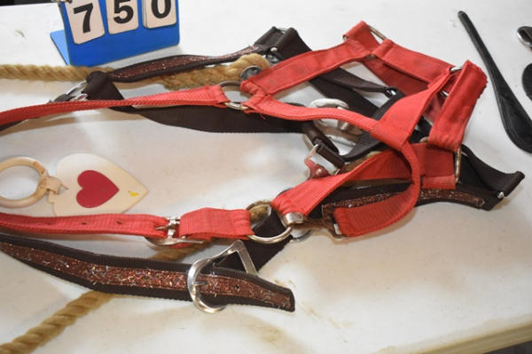 Tack hook with new bling draft halter, 1 red used draft halter and 3 decorative harness fobs
