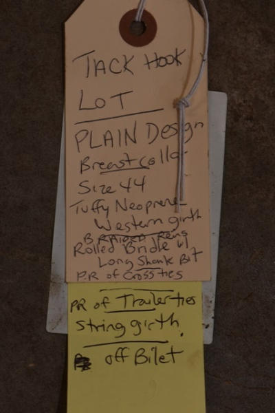 Tack hook lot including plain design breast collars (size 44), Tuffy neoprene western girth, rolled bridle, long shank bit, pair of trailer ties, string girth and off billet