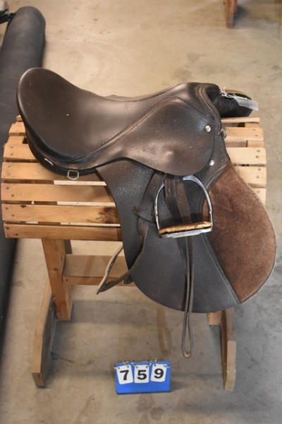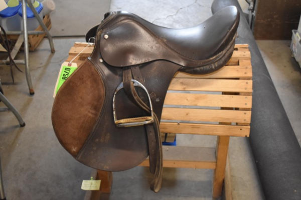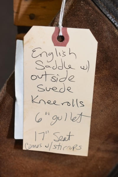 English saddle with outside suede knee rolls, 6" gullet, 17" seat, comes with stirrups