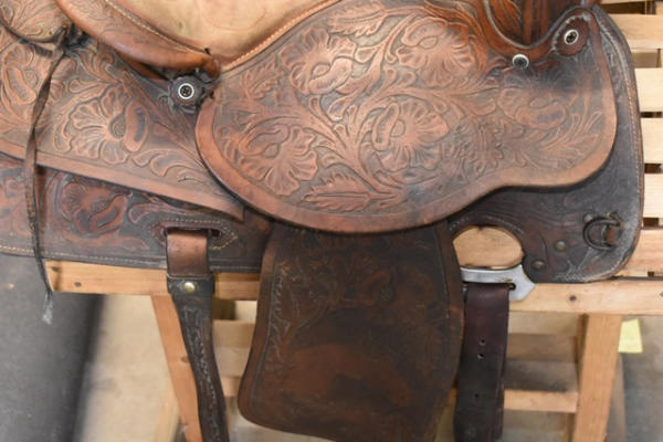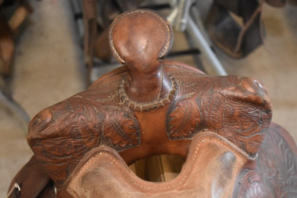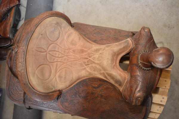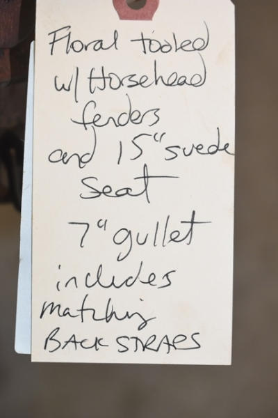 Saddle, Floral tooled with horse head fenders and 15" seat, 7" gullet, includes matching back straps