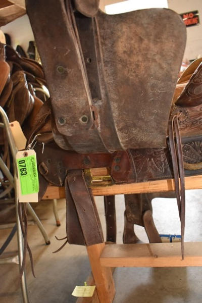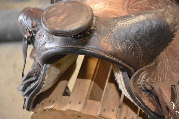Saddle, 16" tooled suede seat, with horse head and fenders, hard to find matching horse head, stirrups, 7 1/2" gullet and folding saddle rack