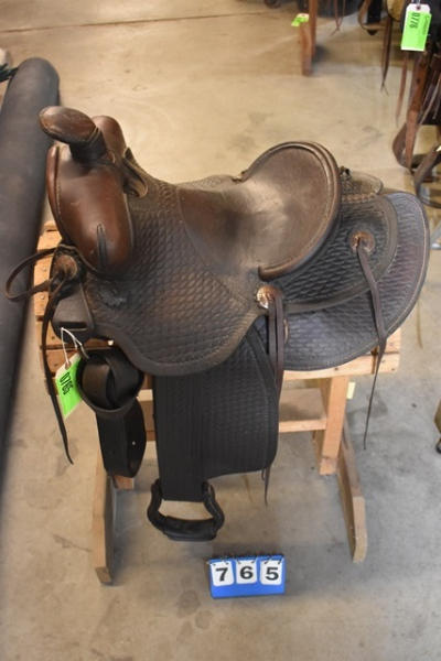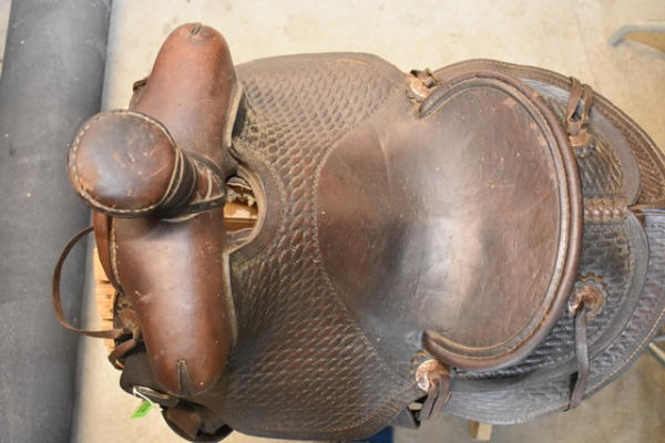 Saddle with antique basketweave double skirted round with fenders and outside leathers, has the antique leather carved stirrups, leather wrapped horn, 13" seat with 6" gullet