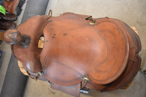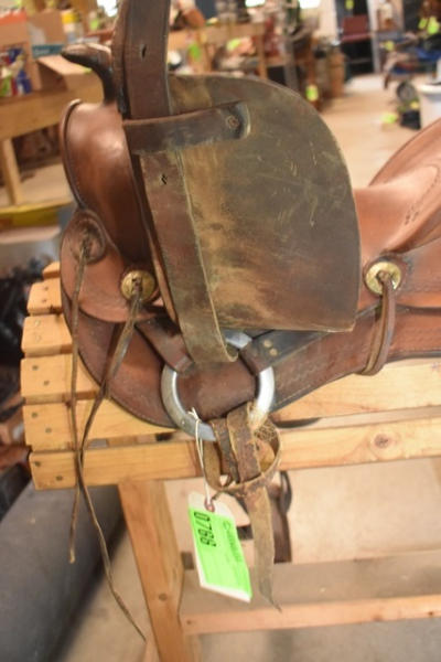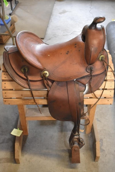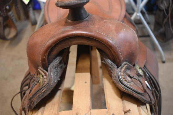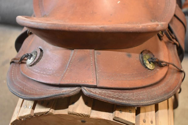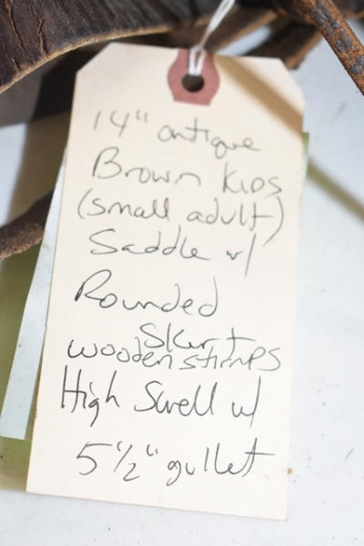 Saddle, 14" antique brown, kids/small adult saddle, with rounded skirts, wooden stirrups, high swell with 5 1/2" gullet