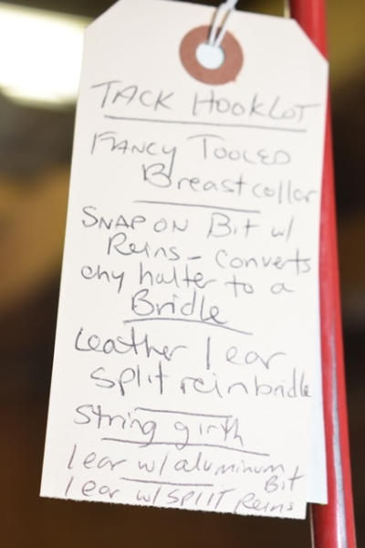 Tack hook lot including fancy tooled breast collars, snap on bit with reins (converts halter to a bridle), leather 1 ear split rein bridle, string girth, 1 ear with aluminum bit, 1 ear with split reins