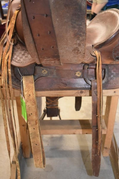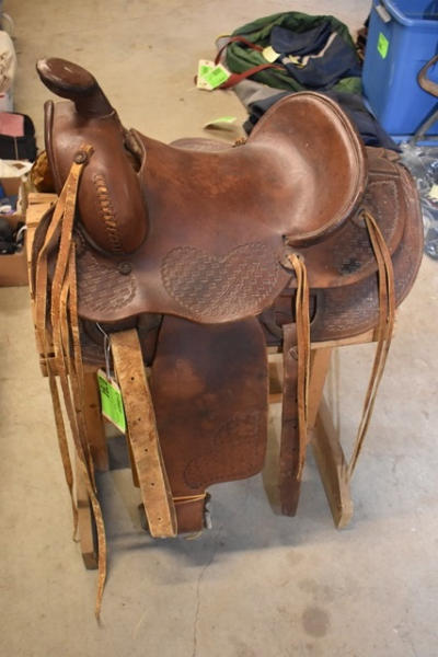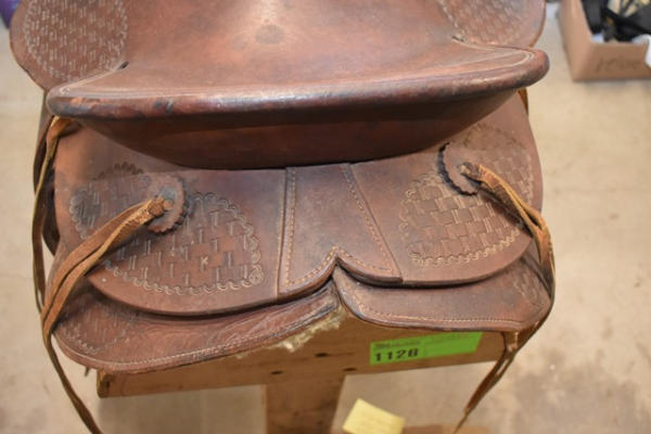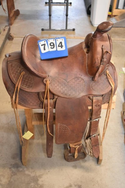 Swell Fork with minimal basket weave tooling, double rig with heavy roping horn, 14" seat, 7 1/2" gullet, roping saddle