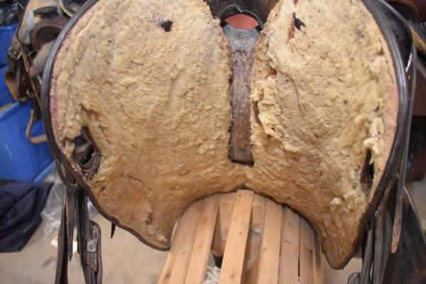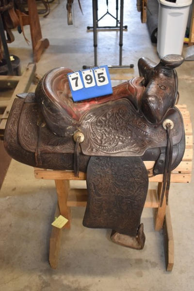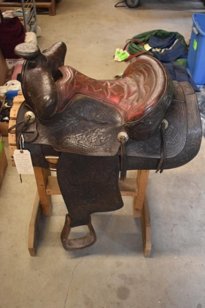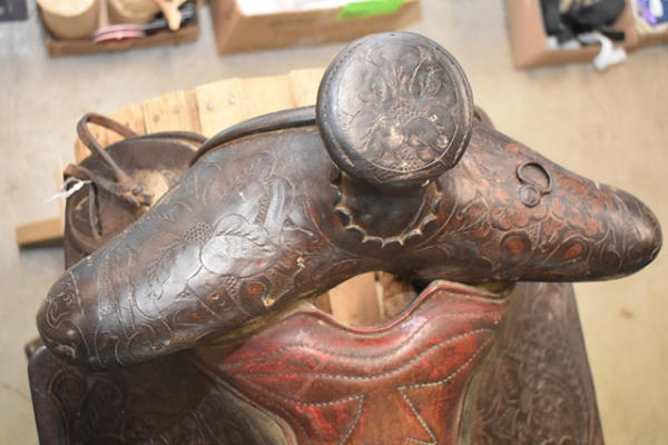 Under Cut Swell with long horn cow stamped on fenders, single rig with leather buckles and padded red seat, 15" seat, 7" gullet