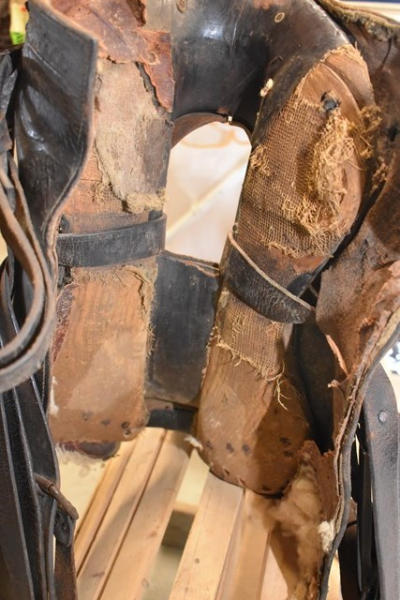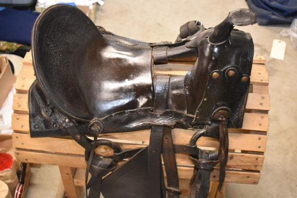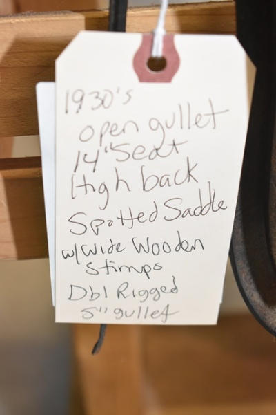 1930 Open gullet, 14" seat, high back spotted saddle, with wide wooden stirrups, double rigged, 5" gullet