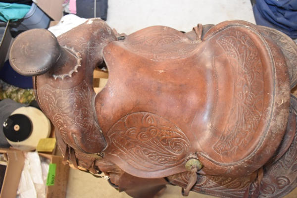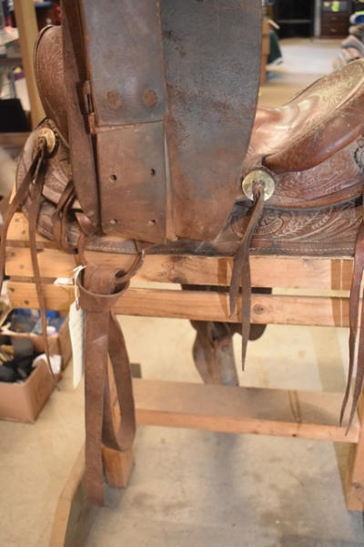 Roping saddle with floral tooling, Pelican horn, 14" seat, 7" gullet
