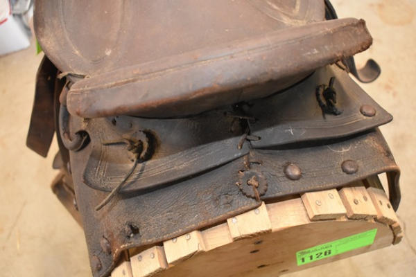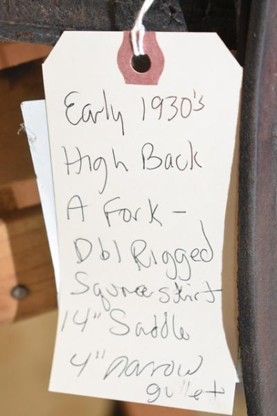 Early 1930 saddle, high back, A fork, double rigged, square skirt, 14" saddle, 4" narrow gullet