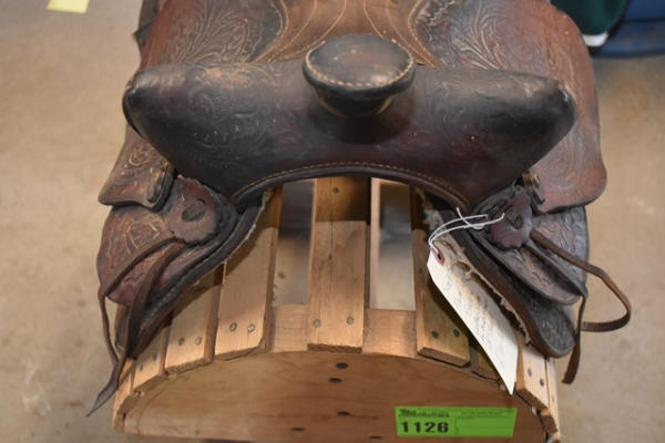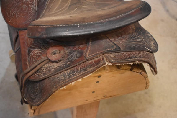 Suede seat, floral tooled saddle, leather slot for back strap, 15" seat, 6" gullet