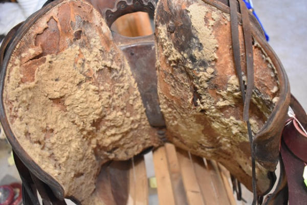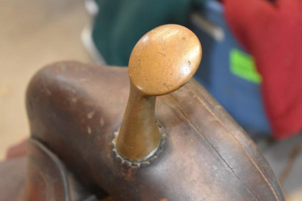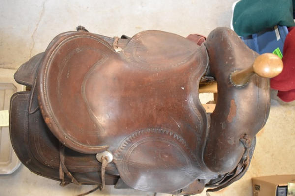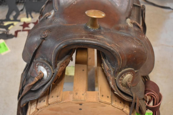 Western Saddle Company, Denver, CO, high back, deep seat with brass horn, 15" seat, 6" gullet, outside stirrup fenders and round stirrups
