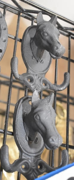 Lot of 2 horse head bridle hooks, 3 misc. horseshoe shaped hooks and 2 cowboy bucking cutouts