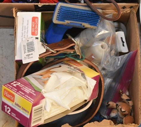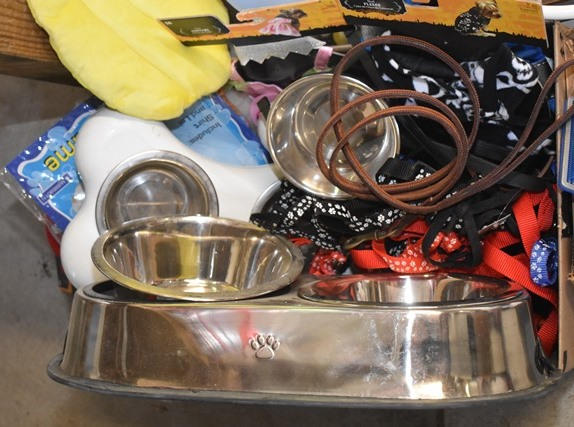 Large lot consisting of food dishes, pet toys, animal costumes, leather leads, cat and dog toys, stainless steel feeding bowls, small fleece pet bed