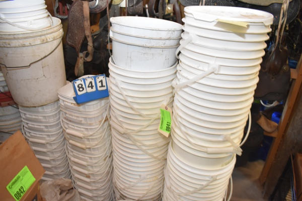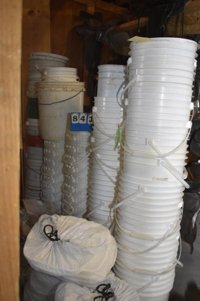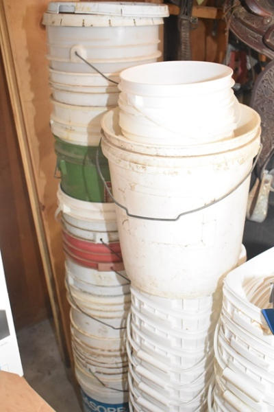 Large lot of various size plastic buckets and bags of lids