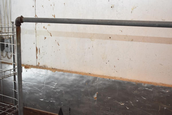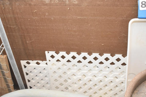 Lot consisting of pipe coat rack, oil catch basin, lumber, 2 sheets of insulation board