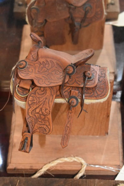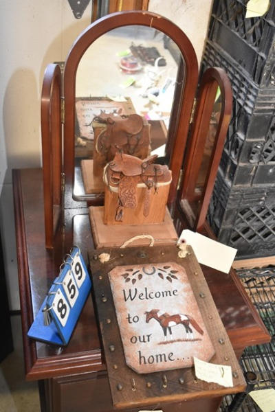 Homemade miniature leather saddle with mirror and a "Welcome to our Home" plaque that is 9 1/2" x 14" (slate)