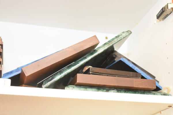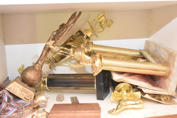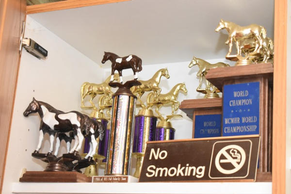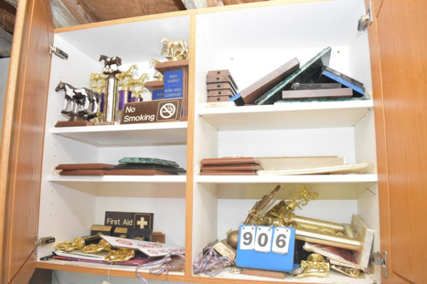 Cabinet contents consisting of assorted trophies, "No Smoking" sign, etc.