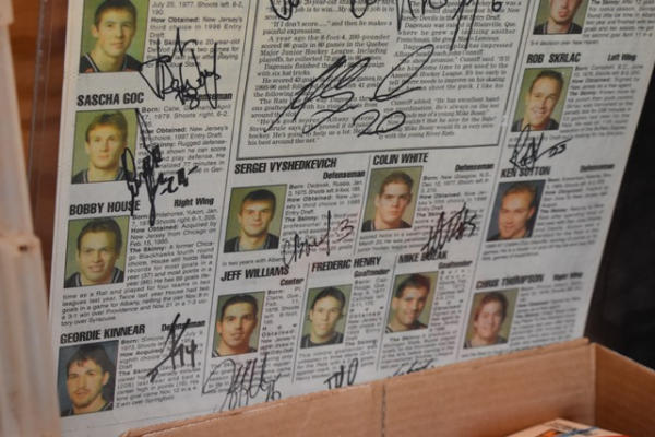 Lot of hockey cards, most from Albany River Rats, early New Jersey Devils Farm Team and others from late 90s. Also includes autographed newspaper with pictures.