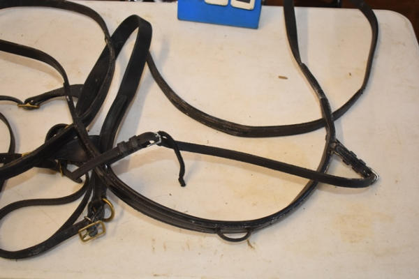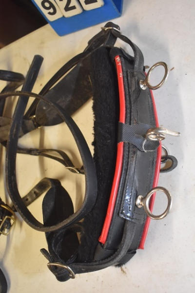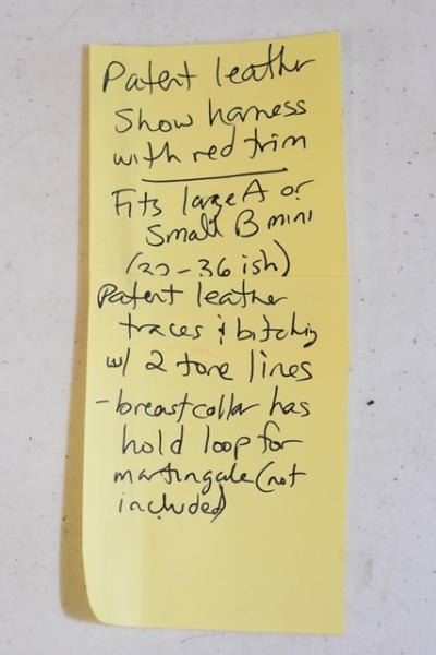 Patent leather show harness with red trim, fits large A or small B mini, 32" - 36", patent leather traces and bits with 2-tone lines, breast collar, breast collar has hold loop for martingale (not included)