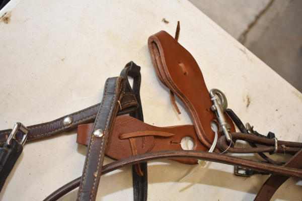 Circle Y rolled show halter, Circle Y raised scallop breast collar with silver conchos accents, 4 running martingale tie downs, patent leather breast collar, padded breast collar, floral tooled breast collar, new slobber straps, 3 1-ear leather wood brow band leather head stall, buckle check pieces, bucking strap, gaming rein, leather, new nylon halter, tie down, back cinch, attachment leather