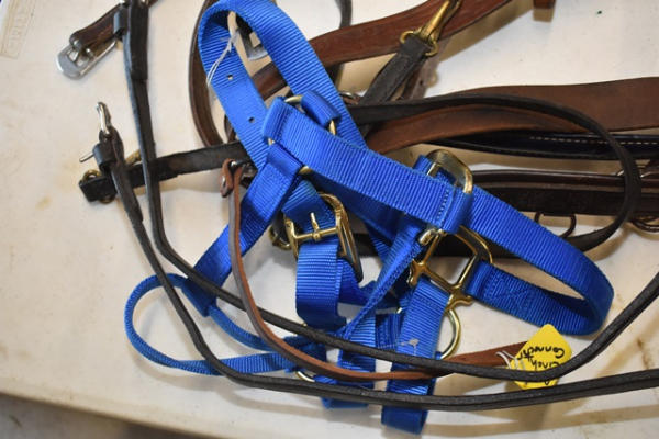 #961 – Circle Y rolled show halter, Circle Y raised scallop breast collar with silver conchos accents, 4 running martingale tie downs, patent leather breast collar, padded breast collar, floral tooled breast collar, new slobber straps, 3 1-ear leather wood brow band leather head stall, buckle check pieces, bucking strap, gaming rein, leather, new nylon halter, tie down, back cinch, attachment leather