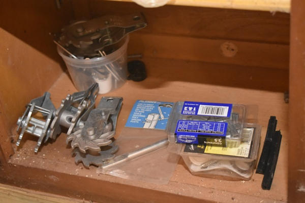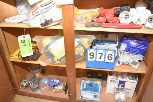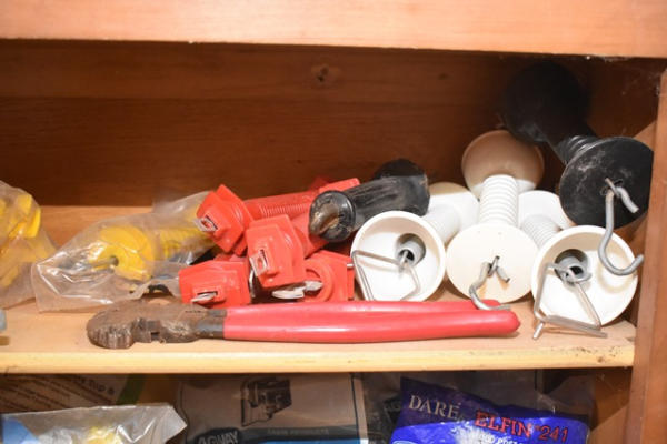 Cabinet contents consisting of fence pliers, gate handles, U-post insulators, T-post toppers, wood post insulators, safe fence corner insulators, etc.