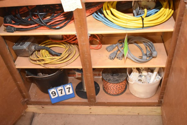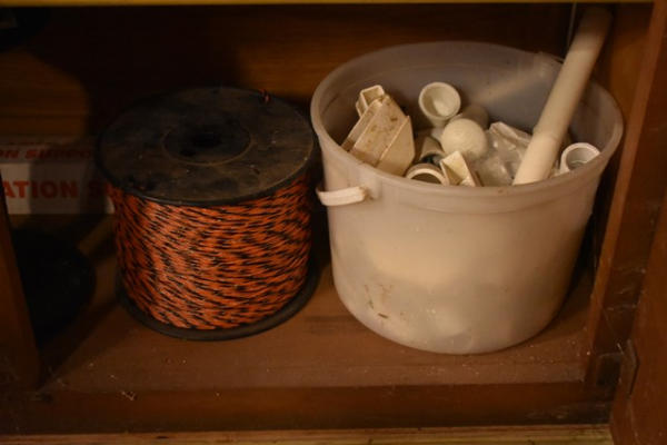 Cabinet contents consisting of 7 extension cords, 2 boxes of insulation supports, pail with U-shaped fence staples, spool of hot wire, partial spool of wire