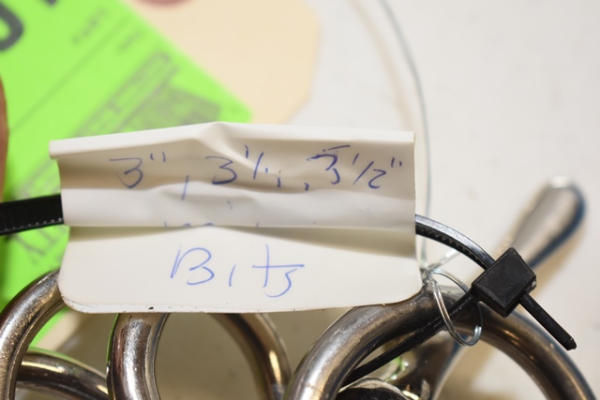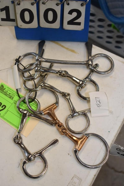 Lot of 5 3", 3 1/2", and 3 1/4" mini bits, French link D ring, straight mouth driving bit, and 3 spoon snaffle bits