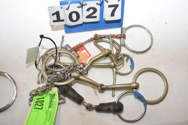 Lot of 5 5 1/4" English bits including a copper single twisted wire Kimberwick, rubber covered snaffle, large O-ring snaffle and a full cheek snaffle of the Never Rust steel