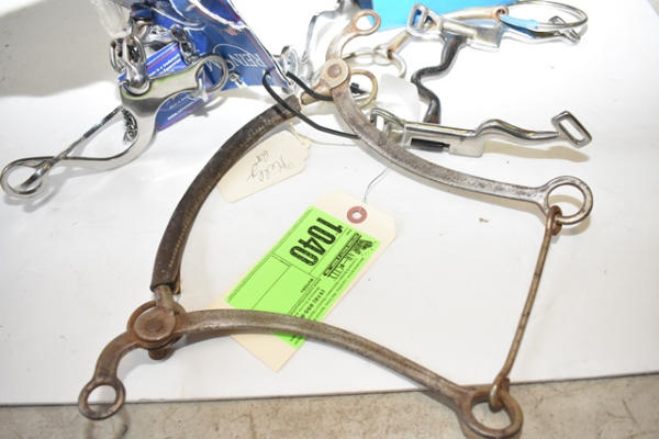 Lot of 5 bits including Leather covered hackamore, Reinsman new chain flyer, grazing bit, Sweet Iron grazing bit and an O-ring snaffle